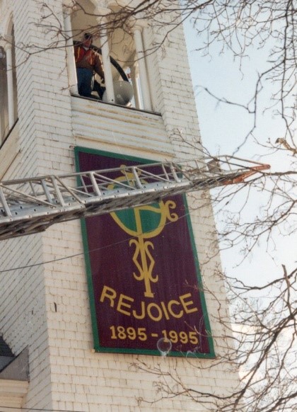 In 1995 the fire department helped us hang our banner to celebrate the 100th birthday of our building.
